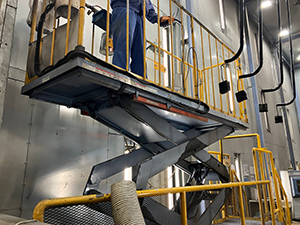 輸送用機器を製造している当社は扱っている製品が大きく、塗装工程では上下に動く昇降リフトに乗って作業を行っています。